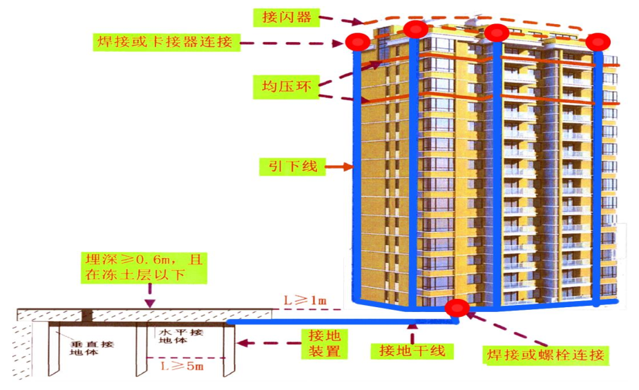 所以接閃器的布置位置通常在建筑物的頂部以及靠近頂部的位置,其中避雷針、避雷帶、避雷線和避雷網(wǎng)都布置在房頂,而均壓環(huán)是高層建筑物為防止擊雷而設(shè)計的環(huán)繞建筑物周邊的水平避雷帶。布置在高層建筑側(cè)面防止側(cè)擊雷的發(fā)生,他們的具體設(shè)置原則我國都有相應(yīng)的規(guī)范做了規(guī)定,在設(shè)計及施工時要嚴(yán)格執(zhí)行。