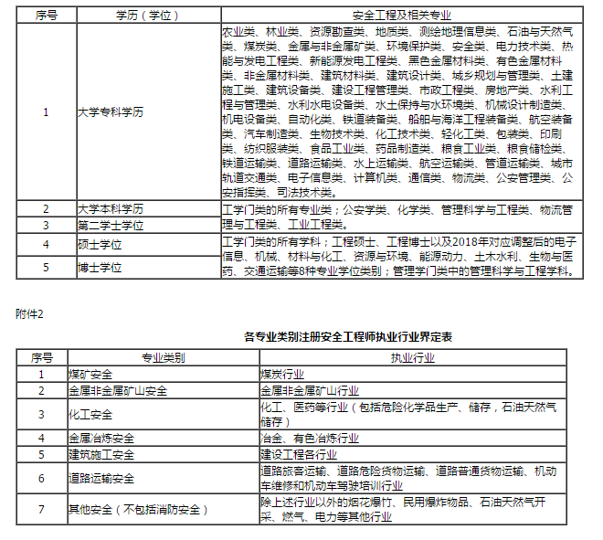 (一)具有安全工程及相關(guān)專業(yè)(附件1)大學??茖W歷,從事安全生產(chǎn)業(yè)務滿5年;或具有其他專業(yè)大學專科學歷,從事安全生產(chǎn)業(yè)務滿7年。