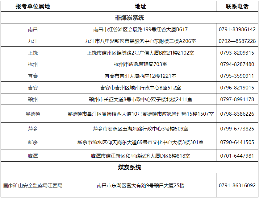 應(yīng)試人員(含省直、中央駐贛單位的應(yīng)試人員)將材料交所在單位審核后,按屬地管理辦法,由所在單位指定經(jīng)辦人員統(tǒng)一報(bào)送(不受理以個(gè)人名義報(bào)送的材料),非煤炭系統(tǒng)應(yīng)試人員經(jīng)設(shè)區(qū)市應(yīng)急管理局,煤炭系統(tǒng)應(yīng)試人員經(jīng)國(guó)家礦山安全監(jiān)察局江西局現(xiàn)場(chǎng)人工核查(地址電話見附件5)合格后,由核查部門統(tǒng)一匯總報(bào)送到設(shè)區(qū)市人力資源社會(huì)保障局辦理報(bào)名確認(rèn)手續(xù)。
