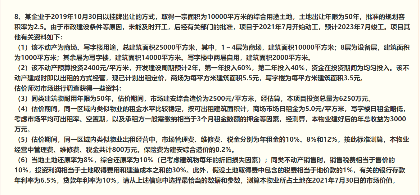 某企業(yè)于2020年10月以掛牌出讓的方式,取得一宗面積為10000m2的綜合用途土地,土地出讓年期為50年,批準(zhǔn)的規(guī)劃容積率為2.5。出讓合同中約定,當(dāng)土地使用權(quán)期限屆滿后無償收回土地使用權(quán)及地上建筑物。由于市政建設(shè)條件等原因,未能及時開工,后經(jīng)有關(guān)部門批準(zhǔn),項目于2022年7月30日開始動工,預(yù)計2024年7月30日竣工。估價師經(jīng)過對該宗地及周圍區(qū)域調(diào)查,搜集了如下相關(guān)數(shù)據(jù)資料: