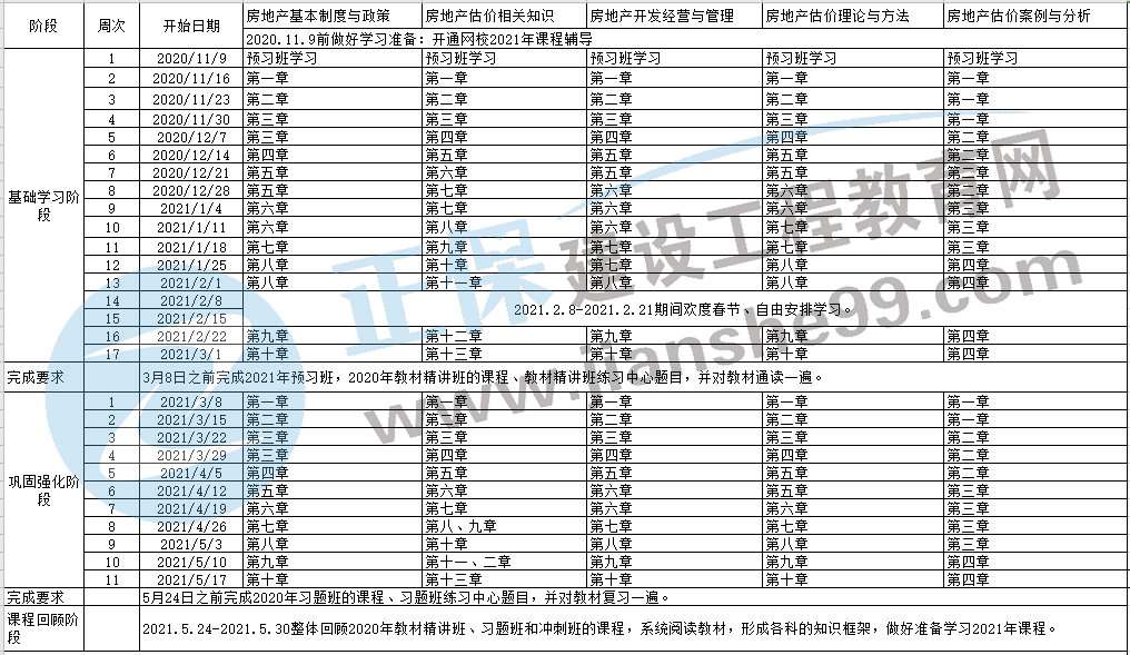 1、整體進(jìn)度說(shuō)明:本計(jì)劃表從2020年11月8日開(kāi)始執(zhí)行,計(jì)劃于2021年5月30日結(jié)束,共計(jì)31周;其中:基礎(chǔ)學(xué)習(xí)階段安排15周,春節(jié)調(diào)整階段安排2周,鞏固強(qiáng)化階段安排11周,課程整體回顧階段安排3周。學(xué)員可根據(jù)本表的提示,結(jié)合自己的工作、學(xué)習(xí)情況進(jìn)行細(xì)化,并按網(wǎng)校要求完成聽(tīng)課、做題的學(xué)習(xí)任務(wù),基本可滿(mǎn)足考試需要。