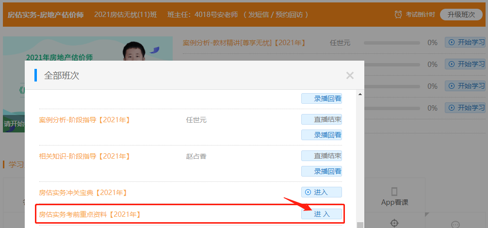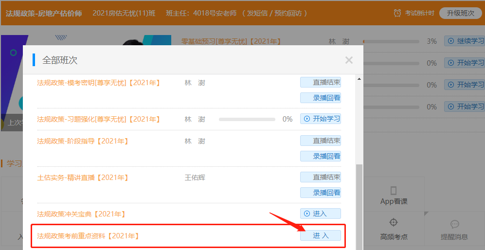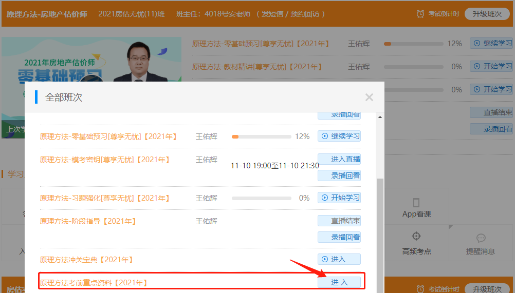 如果您是房地產(chǎn)估價(jià)師尊享無憂班學(xué)員,在建設(shè)工程教育網(wǎng)首頁登錄賬號(hào)后進(jìn)入“我的網(wǎng)校我的家”,點(diǎn)擊“我的課程”,選擇課程科目,查看全部班次,就能看到各個(gè)科目的考前重點(diǎn)資料下載入口了: