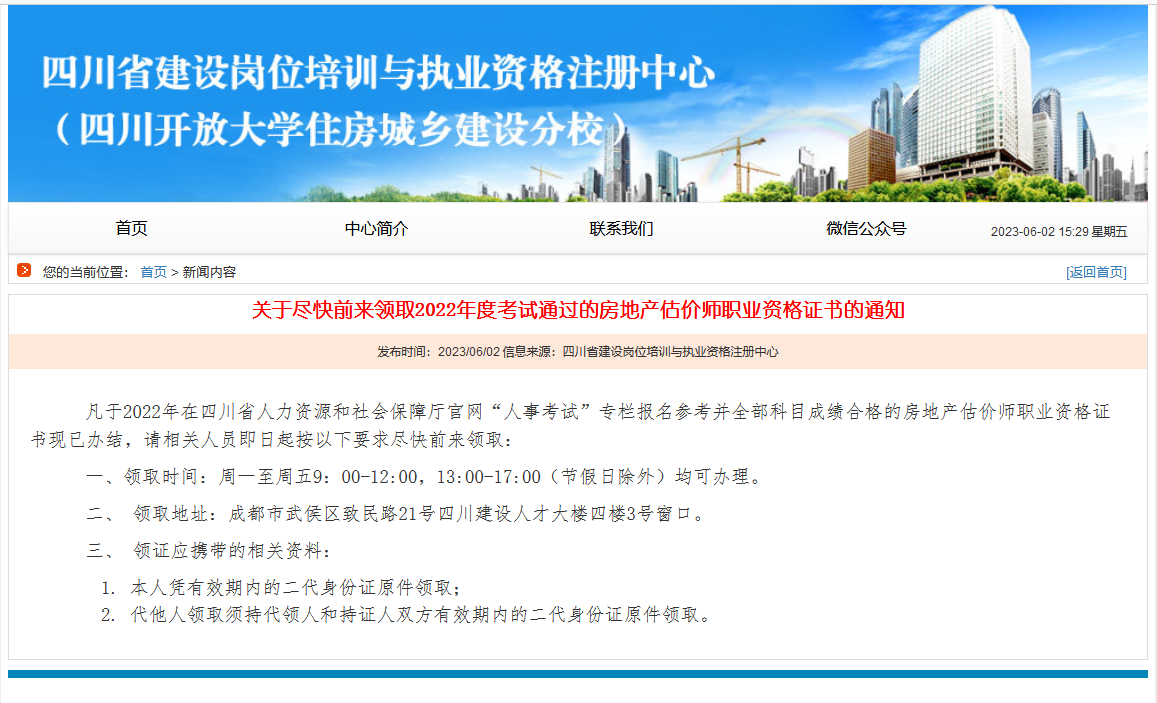 關于領取2022年度考試通過的四川房地產(chǎn)估價師職業(yè)資格證書的通知