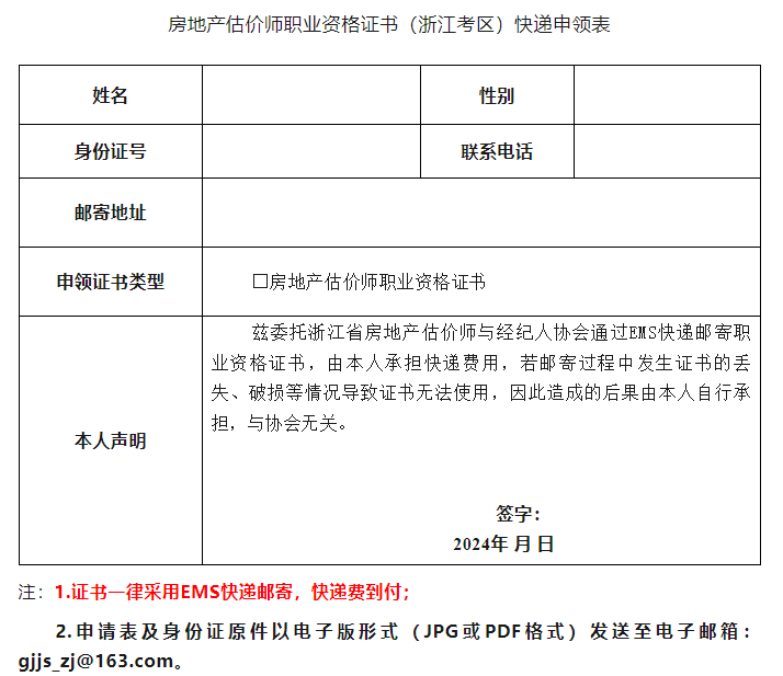 2、快遞申領(lǐng)方式:填寫(xiě)《2023年房地產(chǎn)估價(jià)師職業(yè)資格證書(shū)快遞申請(qǐng)表》(詳見(jiàn)附件)并將申請(qǐng)表及身份證原件以電子版形式(JPG或PDF格式)發(fā)送至郵箱:gjjs_zj 163.com。