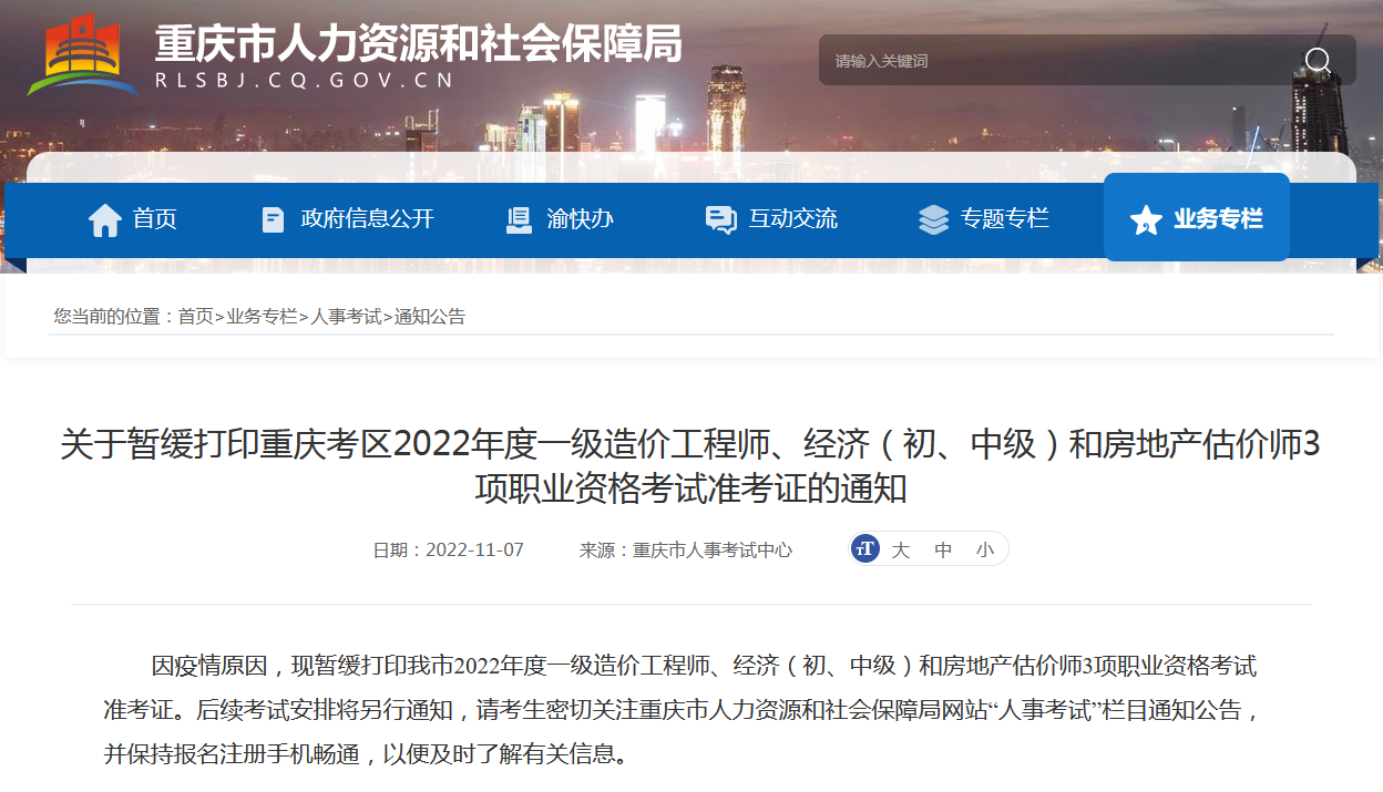 關(guān)于暫緩打印重慶考區(qū)2022年度一級造價工程師、經(jīng)濟(初、中級)和房地產(chǎn)估價師3項職業(yè)資格考試準(zhǔn)考證的通知