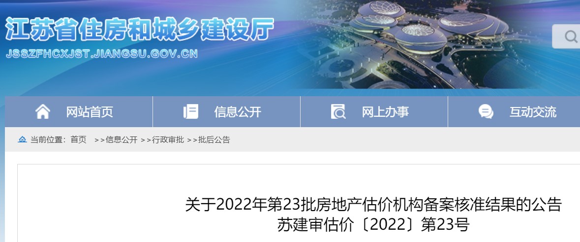 江蘇省關(guān)于2022年第23批房地產(chǎn)估價機構(gòu)備案核準(zhǔn)結(jié)果的公告
