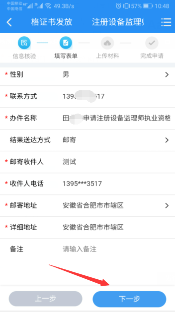 6.填寫收件人姓名、電話和郵寄地址后,點(diǎn)擊“下一步”