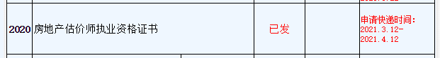 根據(jù)浙江人事考試網(wǎng)發(fā)布的《 資格證書領(lǐng)取時(shí)間安排表》,浙江2020年房地產(chǎn)估價(jià)師證書已發(fā),申請(qǐng)快遞時(shí)間:3月12日至4月12日。