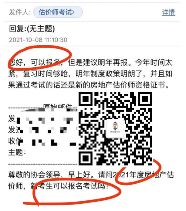 近日,有新考生通過電子郵件向協(xié)會詢問今年房地產(chǎn)估價師考試報名事宜。協(xié)會郵件回復(fù)截圖如下: