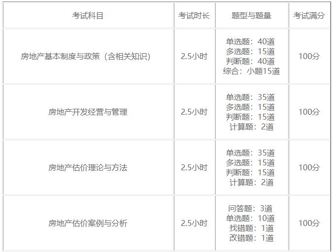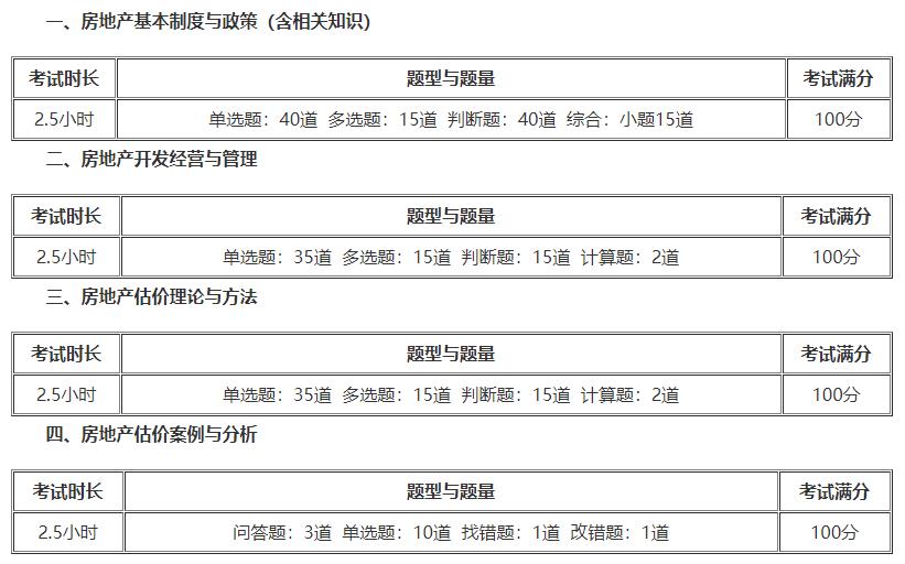 其中,房地產(chǎn)基本制度與政策(含相關(guān)知識)有單選:40道、多選:15道、判斷:40道、綜合:小題15道;房地產(chǎn)開發(fā)經(jīng)營與管理有單選:35道、多選:15道、判斷:15道、計算:2道;房地產(chǎn)估價理論與方法有單選:35道、多選:15道、判斷:15道、計算:2道;房地產(chǎn)估價案例與分析有問答:3道、單選:10道、找錯:1道、改錯:1道。