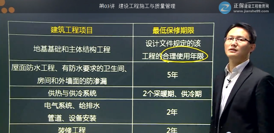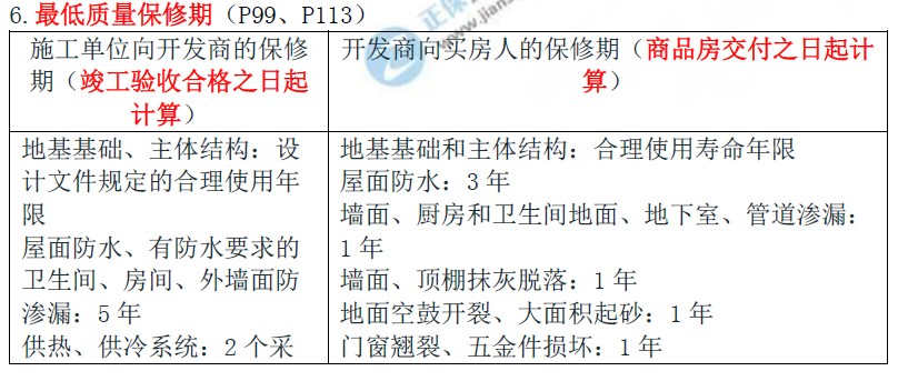 在基礎(chǔ)學(xué)習(xí)班第四章第03講中,武勁松老師用表格的形式直觀的列出“建筑工程項目”“最低保修期限”的相關(guān)考點(diǎn),考生能夠直觀的了解并掌握改考點(diǎn)。