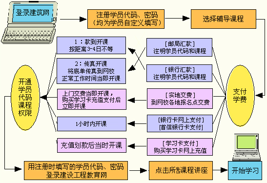 備注:如果是通過在網(wǎng)校各地學(xué)習(xí)卡代理商那里購買學(xué)習(xí)卡支付學(xué)費(fèi)的,則流程中將省去郵局、銀行匯款,網(wǎng)上支付、發(fā)傳真等項(xiàng),而且課程是當(dāng)時(shí)充值、當(dāng)時(shí)開通的。