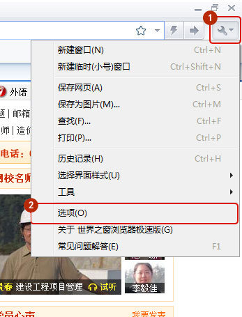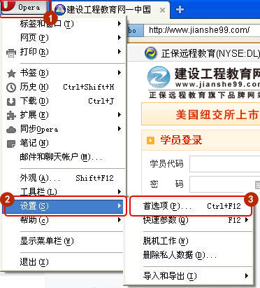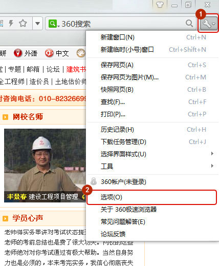 打開瀏覽器,先登錄到建設(shè)工程教育網(wǎng)的頁面(這步很重要),點(diǎn)擊右上角小扳手-選項(xiàng),如圖所示: