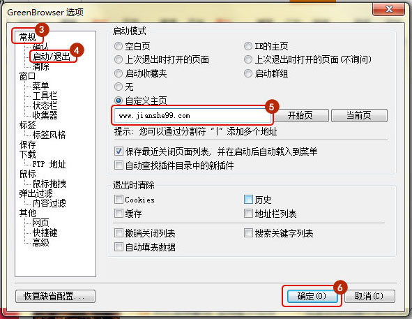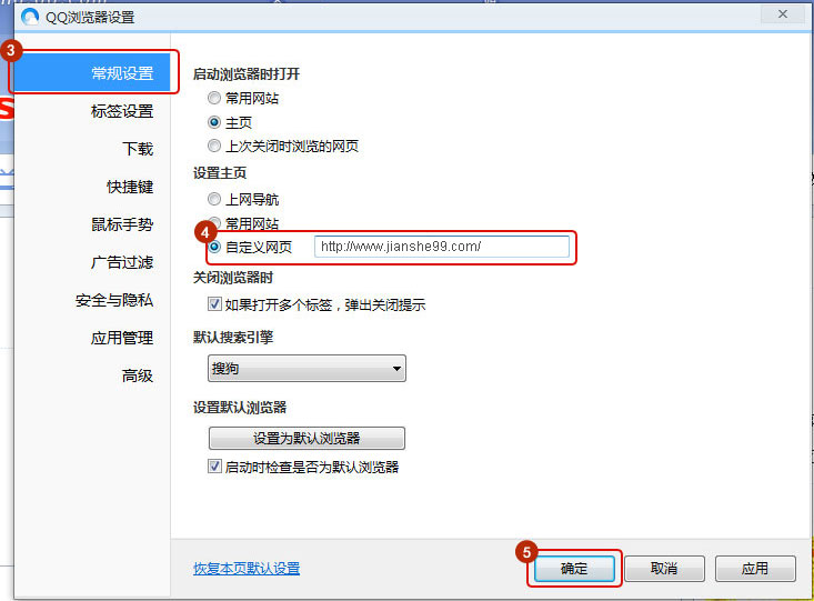 選擇常規(guī)設(shè)置選項(xiàng),勾選自定義網(wǎng)址,并輸入www.mm34228.com點(diǎn)擊保存,就設(shè)定建設(shè)工程教育網(wǎng)為主頁。