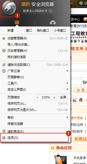 打開獵豹瀏覽器輸入并訪問 www.mm34228.com后,點(diǎn)擊左上角豹頭>>選項(xiàng)。
