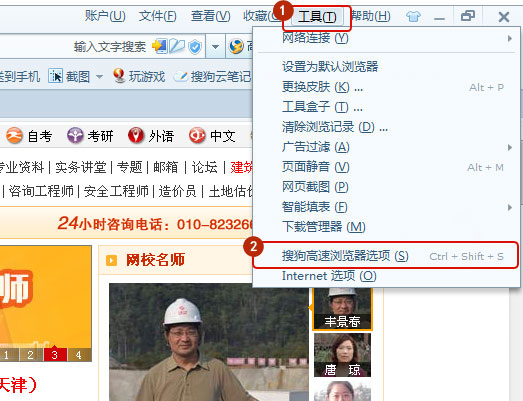 打開搜狗瀏覽器,點(diǎn)擊菜單里的工具 - 搜狗高速瀏覽器選項(xiàng),如圖所示: