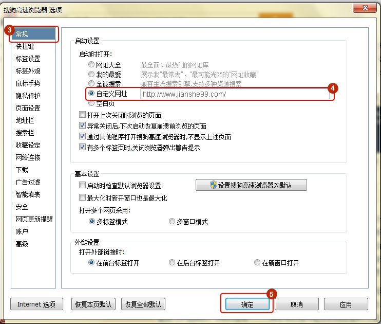 選擇常規(guī)選項(xiàng), 在啟動(dòng)設(shè)置里選擇自定義網(wǎng)址,并輸入www.mm34228.com,點(diǎn)擊確定。
