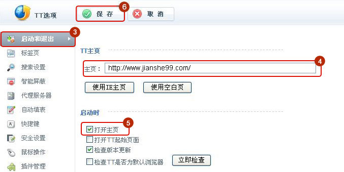 選擇啟動(dòng)和退出,輸入www.mm34228.com為主頁,勾選啟動(dòng)時(shí)打開主頁。最后別忘了點(diǎn)擊保存按鈕。