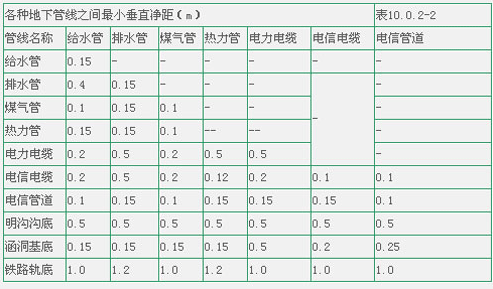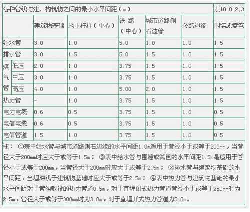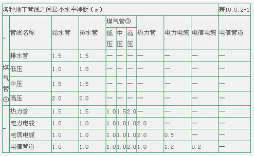 注: ①表中給水管與排水管之間的凈距適用于管徑小于或等于200mm,當管徑大于200mm時應大于或等于3.0m; ②大于或等于10kv的電力電纜與其它任何電力電纜之間應大于或等于0.25m,如加套管,凈距可減至0.1m;小于10kv電力電纜之間應大于或等于0.1m; ③低壓煤氣管的壓力為小于或等于0.005MPa,中壓為0.005~0.3MPa,高壓為0.3~0.8MPa.