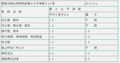 8) 地下管線不宜橫穿公共綠地和庭院綠地。與綠化樹種間的最小水平凈距,宜符合表10.0.2-4中的規(guī)定。