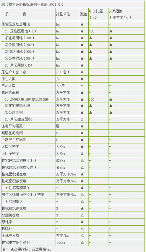 1、居住區(qū)綜合技術經(jīng)濟指標的項目應包括必要指標和可選用指標兩類,其項目及計量單位應符合表11.0.1規(guī)定。