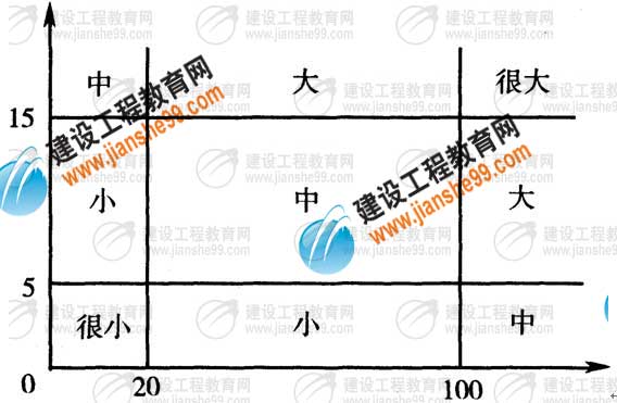 六、某工程,施工單位向項(xiàng)目監(jiān)理機(jī)構(gòu)提交了項(xiàng)目施工總進(jìn)度計(jì)劃(圖6-1)和各分部工程的施工進(jìn)度計(jì)劃。項(xiàng)目監(jiān)理機(jī)構(gòu)建立了各分部工程的持續(xù)時(shí)間延長(zhǎng)的風(fēng)險(xiǎn)等級(jí)劃分圖(圖6-2)和風(fēng)險(xiǎn)分析表(表6-1),要求施工單位對(duì)風(fēng)險(xiǎn)等級(jí)在“大”和“很大”范圍內(nèi)的分部工程均要制定相應(yīng)的風(fēng)險(xiǎn)預(yù)防措施。