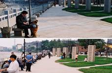 II區(qū)以水景和平地廣場為主。清晨和傍晚常有大量的群眾性體育活動開展。與對岸I區(qū)的濱河休閑走廊相呼應(yīng),設(shè)大量石條凳,以供休憩、觀景。