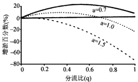 根據(jù)(2)式計算了不同分流分沙比時對河道增加淤積的情況(圖2)。圖中縱坐標為增淤百分數(shù),等于(ΔW′s1-2-ΔWs1-2)/Ws1.由圖可以看出:河段內(nèi)引水對河道沖淤影響與原河道沖淤(Ps21)、分流比(q)、分沙比(a)和流量指數(shù)(α)有關,并得到以下幾點認識: