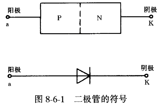 6.1 半導(dǎo)體二極管半導(dǎo)體二極管是在一個(gè)PN結(jié)的兩側(cè),各引出一根金屬電極,并用外殼封裝起來(lái)而構(gòu)成的。由P區(qū)引出的電極稱陽(yáng)極,由N區(qū)引出的電極稱陰極。電路符號(hào)如圖8—6—1所示。