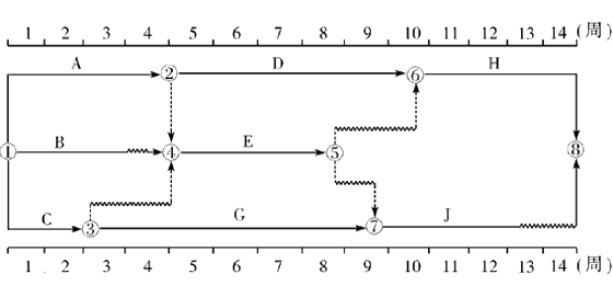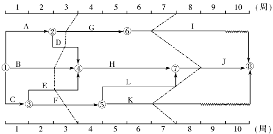 117. 某工程雙代號(hào)時(shí)標(biāo)網(wǎng)絡(luò)計(jì)劃執(zhí)行到第3周末和第7周末時(shí),檢查其實(shí)際進(jìn)度如下圖前鋒線所示,檢查結(jié)果表明( )。