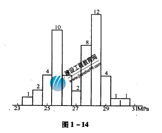 10、【背景】某高速公路施工中,監(jiān)理工程師確認(rèn)的混凝土試配強(qiáng)度為26.5MPa,已知Tu=31MPa;TL=23MPa,混凝土拌制工序的施工采用兩班制,監(jiān)理工程師收集了1個(gè)月的混凝土試塊強(qiáng)度資料,畫出直方圖如下,圖1-14為第五標(biāo)段的直方圖,圖1-15為第六標(biāo)段的直方圖,試對(duì)此二直方圖進(jìn)行分析。