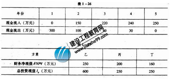 13、某建設(shè)工程項(xiàng)目,監(jiān)理單位參與了建設(shè)單位的前期投資決策。共有甲、乙、丙、丁4種方案可供考慮,計(jì)算工期均為5年,假定行業(yè)基準(zhǔn)收益率設(shè)定為ic=10%,其中甲方案中項(xiàng)目的現(xiàn)金流量如表1—26所示,其他乙、丙、丁3種方案的財(cái)務(wù)