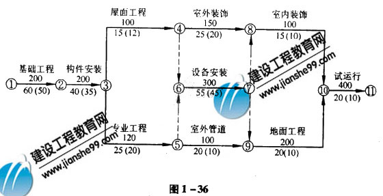 9、【背景】某單項(xiàng)工程按如圖1-36進(jìn)度計(jì)劃正在進(jìn)行施工。圖中箭線上方數(shù)字為工作縮短1天需增加的費(fèi)用(元/天),箭線下括弧外數(shù)字為工作正常施工時(shí)間,箭線下括弧內(nèi)數(shù)字為工作最快施工時(shí)間。原計(jì)劃工期是220天,在第110天檢查時(shí),工作2-3(構(gòu)件安裝)已全部完成,工作3-5(專業(yè)工程)剛剛開始施工,3-4按計(jì)劃進(jìn)行。由于3-5是關(guān)鍵工作,所以它拖后10天,將導(dǎo)致工期延長(zhǎng)10天完成。
