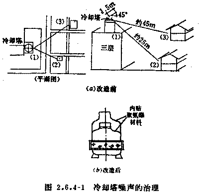 現(xiàn)象:冷卻塔的噪聲。在某居民區(qū)內(nèi)建了一座三層高級辦公樓,屋頂安裝了一個50rt的冷卻塔。白天晚上影響附近居民。如圖2.6.4-1(a)。
