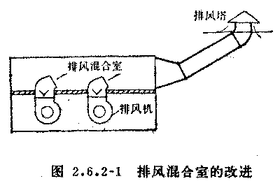 對策:合理地選擇風(fēng)道斷面。在每臺風(fēng)機出口加裝開閉靈活且嚴(yán)密的單流閥。管路盡量減少局部阻力。在排風(fēng)混合室內(nèi)設(shè)一段隔墻,使風(fēng)機出口處的高速氣流互不干擾而通暢地到達(dá)排風(fēng)塔,且每臺排風(fēng)機的出風(fēng)口進入混合室時,都加一個45度彎頭,氣流方向直接對準(zhǔn)排風(fēng)塔的通道。如圖2.6.2-1.