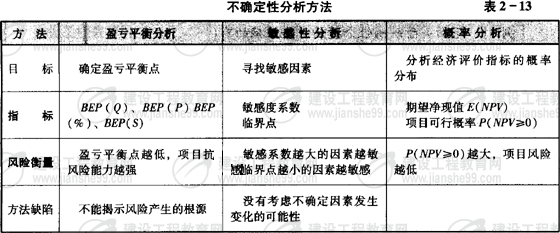 本節(jié)主要介紹了3種不確定性分析方法,每種方法都要求掌握指標(biāo)計(jì)算,熟悉風(fēng)險(xiǎn)分析方法。其中盈虧平衡分析以指標(biāo)計(jì)算為主;敏感性分析要求根據(jù)指標(biāo)計(jì)算結(jié)果分析敏感因素;概率分析以指標(biāo)計(jì)算為主。