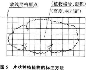 對于邊緣線呈規(guī)則的幾何形狀的片狀種植,可用尺寸標注方法標注,為施工放線提供依據(jù),而對邊緣線呈不規(guī)則的自由線的片狀種植,應繪方格網(wǎng)放線圖,文字標注方法見(圖5),與苗木表相結合,用PQ、PG加阿拉伯數(shù)字分別表示片狀種植的喬木、灌木。
