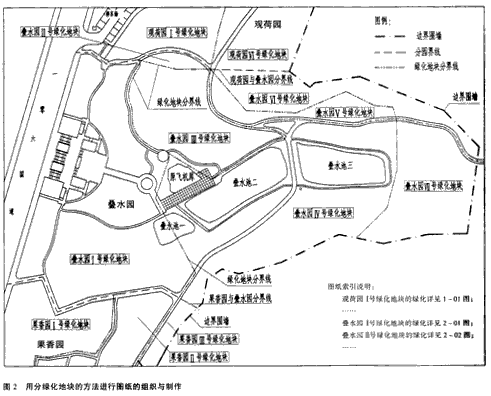 設計范圍的面積有大有小,技術 要求有簡有繁,如果一概都只畫一張平面圖很難表達清楚設計思想與技術要求,制圖時應分別對待處理,在廣州市白云山西側綠化休閑帶綠化設計中,由于設計范圍面積大,設計者采用總平面圖(表達園與園之間的關系,總的苗木統(tǒng)計表)→各平面分圖(表達在一個圖中各地塊的邊界關系,該園的苗木統(tǒng)計表)→各地塊平面分圖(表達地塊內(nèi)的詳細植物種植設計,該地塊的苗木統(tǒng)計表),→重要位置的大樣圖,四級圖紙層次來進行圖紙文件的組織與制作(圖2),使設計文件能滿足施工、招投標和工程預結算的要求。