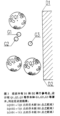 點狀種植有規(guī)則式與自由式種植兩種。對于規(guī)則式的點狀種植(如行道樹,陣列式種植等)可用尺寸標注出株行距,始末樹種植點與參照物的距離。而對于自由式的點狀種植(如孤植樹),可用坐標(采用AutoCAD輔助制圖進,這點很容易做到)標注清楚種植點的位置或采用三角形標注法進行標注(圖3)。