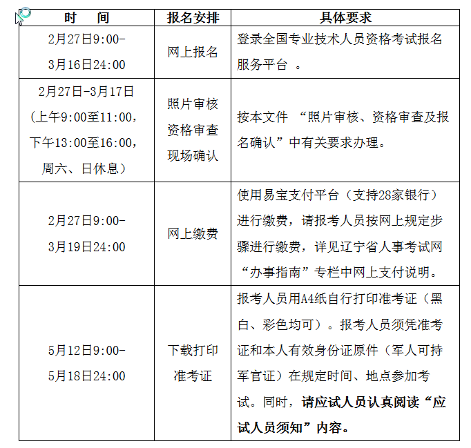 4.新考生(含異地首次轉(zhuǎn)到遼寧報(bào)考考生)報(bào)考時(shí),必須進(jìn)行資格審查和報(bào)名確認(rèn)。現(xiàn)場(chǎng)報(bào)名確認(rèn)后,方可進(jìn)行網(wǎng)上繳費(fèi)。新考生應(yīng)持報(bào)名表(照片審核通過(guò)后即可打。2份、相關(guān)證件(身份證、畢業(yè)證、學(xué)位證、工作年限證明等)原件和復(fù)印件2份到省或市人事職稱(chēng)管理部門(mén)或人事考試部門(mén)進(jìn)行現(xiàn)場(chǎng)資格審查。符合部分科目免試條件的報(bào)考人員還須提交《資格考試科目免試申報(bào)表》2份和免試相關(guān)材料(職稱(chēng)證、培訓(xùn)合格證等)原件及復(fù)印件2份!顿Y格考試科目免試申報(bào)表》和《工作年限證明》可從遼寧人事考試網(wǎng)(www.lnrsks.com)“資料下載”欄目中下載打印,按要求填寫(xiě)并加蓋單位公章。