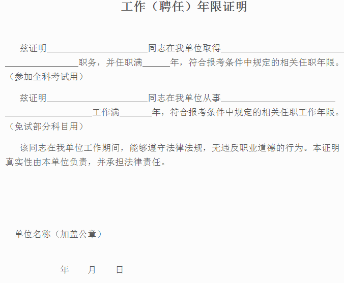 (6)根據(jù)報(bào)考條件所須提供的相應(yīng)業(yè)務(wù)工作(聘任)年限證明1份(加蓋單位公章,模板見附件2)。若對(duì)報(bào)考人員提供的工作(聘任)年限證明有質(zhì)疑,審核人員將根據(jù)報(bào)考者的身份證號(hào)碼,查詢其與報(bào)名單位一致的一年以上基本養(yǎng)老保險(xiǎn)參保相關(guān)信息;
