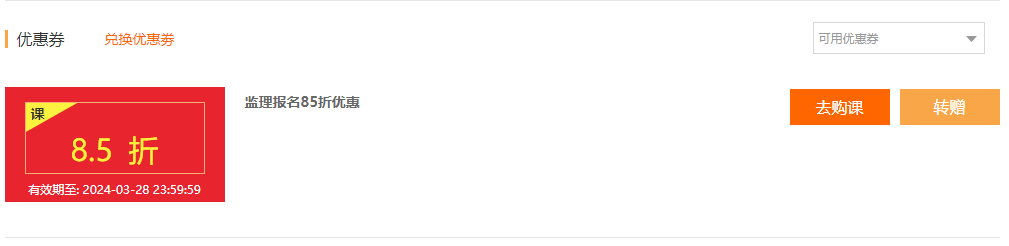 未購(gòu)課的學(xué)員可以領(lǐng)取上方優(yōu)惠券哦,領(lǐng)取成功之后可使用優(yōu)惠券進(jìn)行購(gòu)課,優(yōu)惠券的領(lǐng)取是否成功可以在“我的網(wǎng)校我的家-我的賬戶”中查看。新人購(gòu)課更有多個(gè)福利等你領(lǐng)取喲,快來(lái)參加活動(dòng)吧>>!