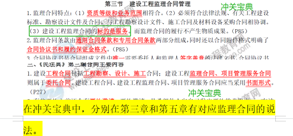 在沖關(guān)寶典中,分別在第三章和第五章有對應監(jiān)理合同的說法。
