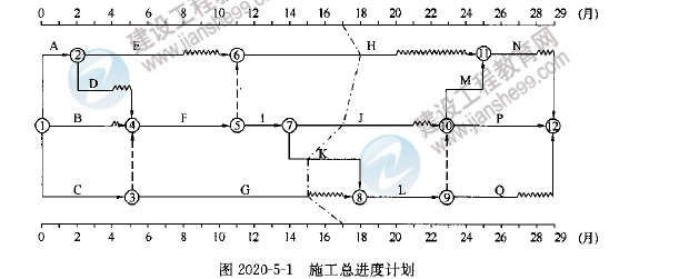 【2020年】(試題五)某工程,建設單位與施工單位按照《建設工程施工合同(示范文本)》簽訂了施工合同。經(jīng)總監(jiān)理工程師審核確認的施工總進度計劃如圖2020-5-1所示,各項工作均按最早開始時間安排且勻速施工。