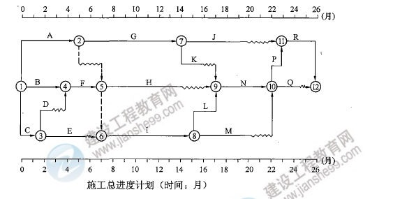 【2018年】(試題五)某工程,建設(shè)單位與施工單位按照《建設(shè)工程施工合同(示范文本)》簽訂了施工合同。經(jīng)總監(jiān)理工程師批準(zhǔn)的施工總進(jìn)度計(jì)劃如圖5-1所示(時(shí)間:月),各工作均按最早開始時(shí)間安排且勻速施工。