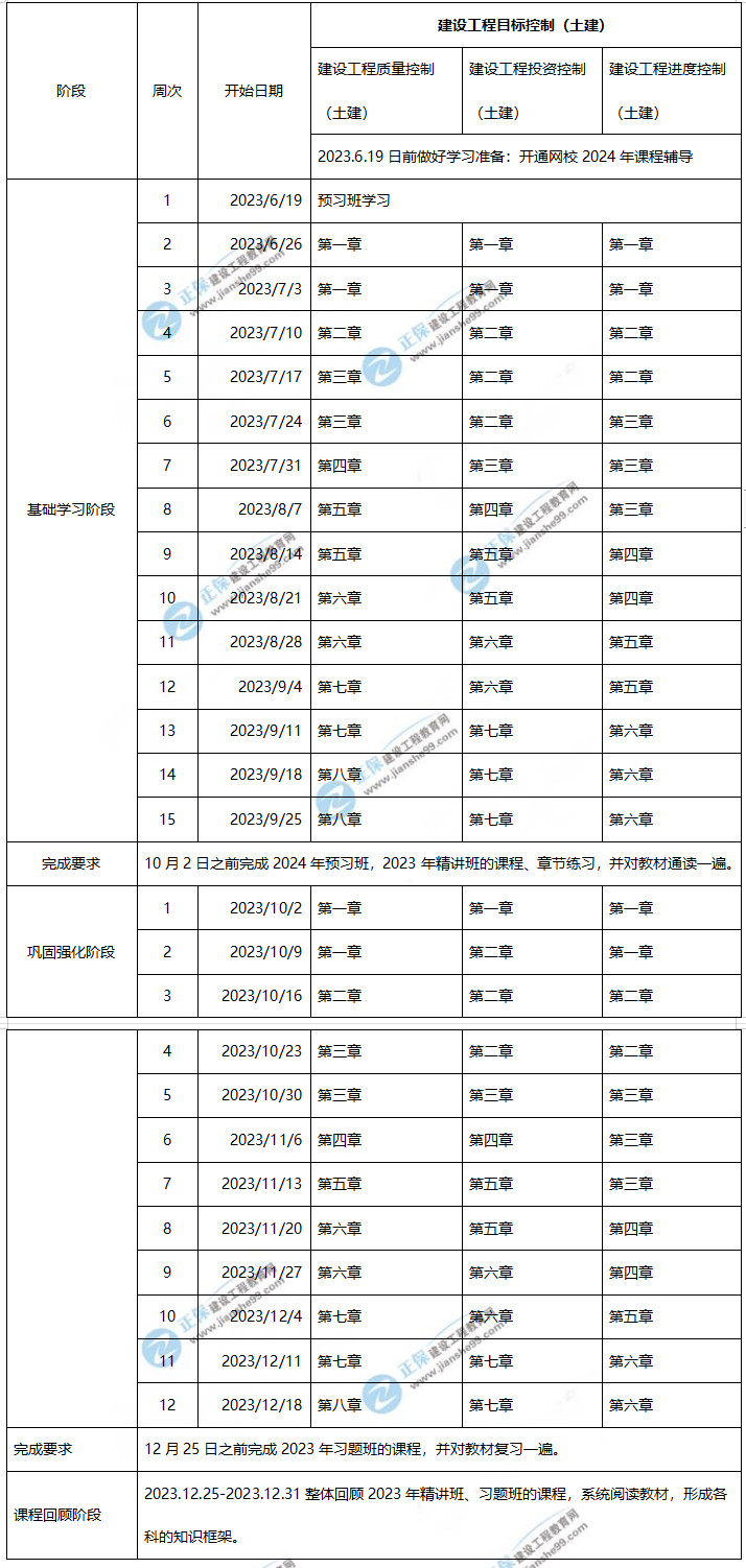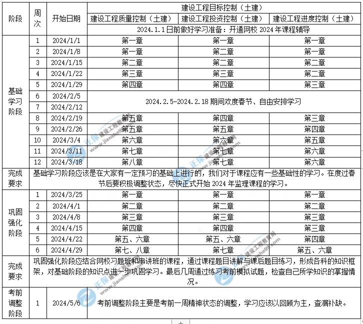 2024年監(jiān)理工程師土建控制學習計劃時間表(1-5月)