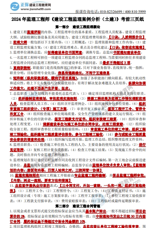 建設(shè)工程教育網(wǎng)的老師們精心整理了2024年監(jiān)理工程師土建案例考前三頁(yè)紙,免費(fèi)發(fā)給大家,臨時(shí)抱佛腳也是有用的,趕快來(lái)領(lǐng)取吧~