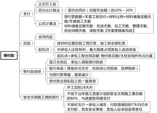1.工程預(yù)付款是由發(fā)包人按照合同約定,在正式開(kāi)工前由發(fā)包人預(yù)先支付給承包人,用于購(gòu)買工程施工所需的材料和組織施工機(jī)械和人員進(jìn)場(chǎng)的價(jià)款。