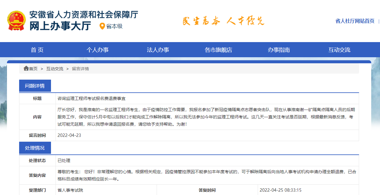 廳長您好,我是淮南的一名監(jiān)理工程師考生,由于疫情防控工作需要,我報(bào)名參加了新冠疫情隔離點(diǎn)志愿者突擊隊(duì),現(xiàn)在從事淮南謝一礦隔離點(diǎn)隔離人員的后期服務(wù)工作,保守估計(jì)5月中旬以后我們才能完成工作解除隔離,所以我無法參加今年的監(jiān)理工程師考試。這幾天一直關(guān)注考試是否延期,根據(jù)最新消息反饋,考試可能無延期,所以我想申請退回報(bào)名費(fèi),請您給予支持幫助。為謝!