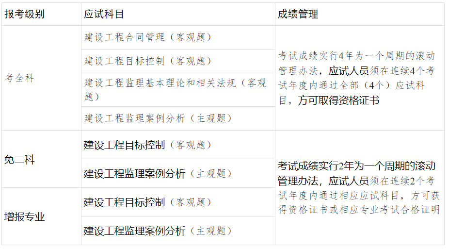 注:《建設(shè)工程合同管理》、《建設(shè)工程監(jiān)理基本理論和相關(guān)法規(guī)》為基礎(chǔ)科目;《建設(shè)工程目標(biāo)控制》、《建設(shè)工程監(jiān)理案例分析》為專業(yè)科目。專業(yè)類別分為土木建筑工程、交通運(yùn)輸工程和水利工程。
